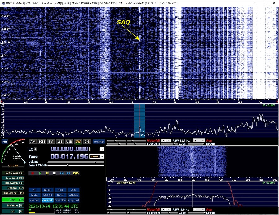 The E-MU 0202 device was set to a sampling rate of 96 kS/s, so the 17.2 kHz of the SAQ station were well inside the first Nyquist zone.